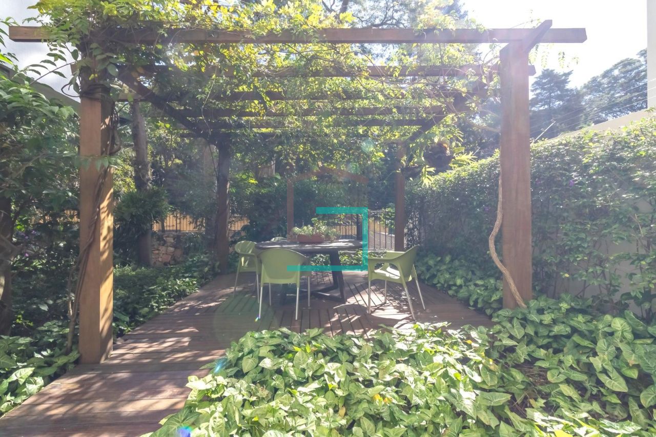 O prédio recuado da rua tem um jardim super bem cuidado.